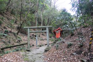 なんとか道はあるので、恐る恐る進んで行く。しばらく歩くと、古く苔の生えた鳥居が現れた。